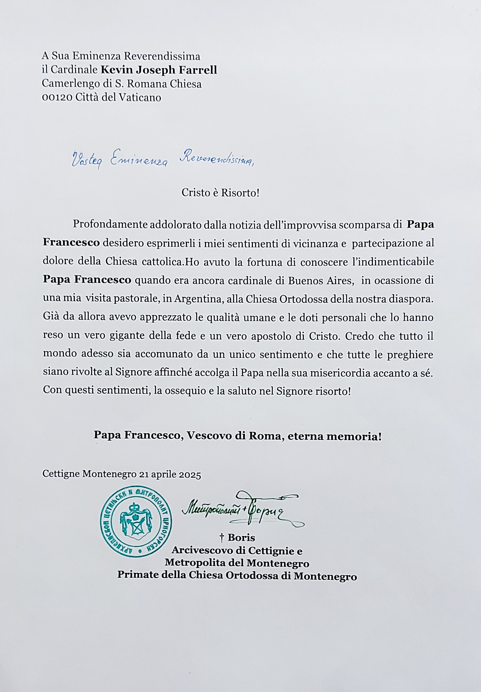Duboko smo ožalošćeni viješću o iznenadnoj smrti pape Franja, želimo da izrazimo svoju bliskost i  učestvujemo u žalosti Katoličke crkve . Imali smo sreću da upoznamo nezaboravnog papu Franja dok je još bio kardinal u Buenos Ajresu, tokom naše pastirske pośete dijaspori i našoj pravoslavnoj crkvi u Argentini. Već tada smo  imali priliku da vidimo ljudske kvalitete i lične vrline koje su ga činjele  pravim divom vjere i Hristovim apostolom. Vjerujem da je cijeli svijet sada ujedinjen jedinstvenim ośećanjem i da su sve molitve upućene Gospodu da primi blizu Papu po svom milosrđu.