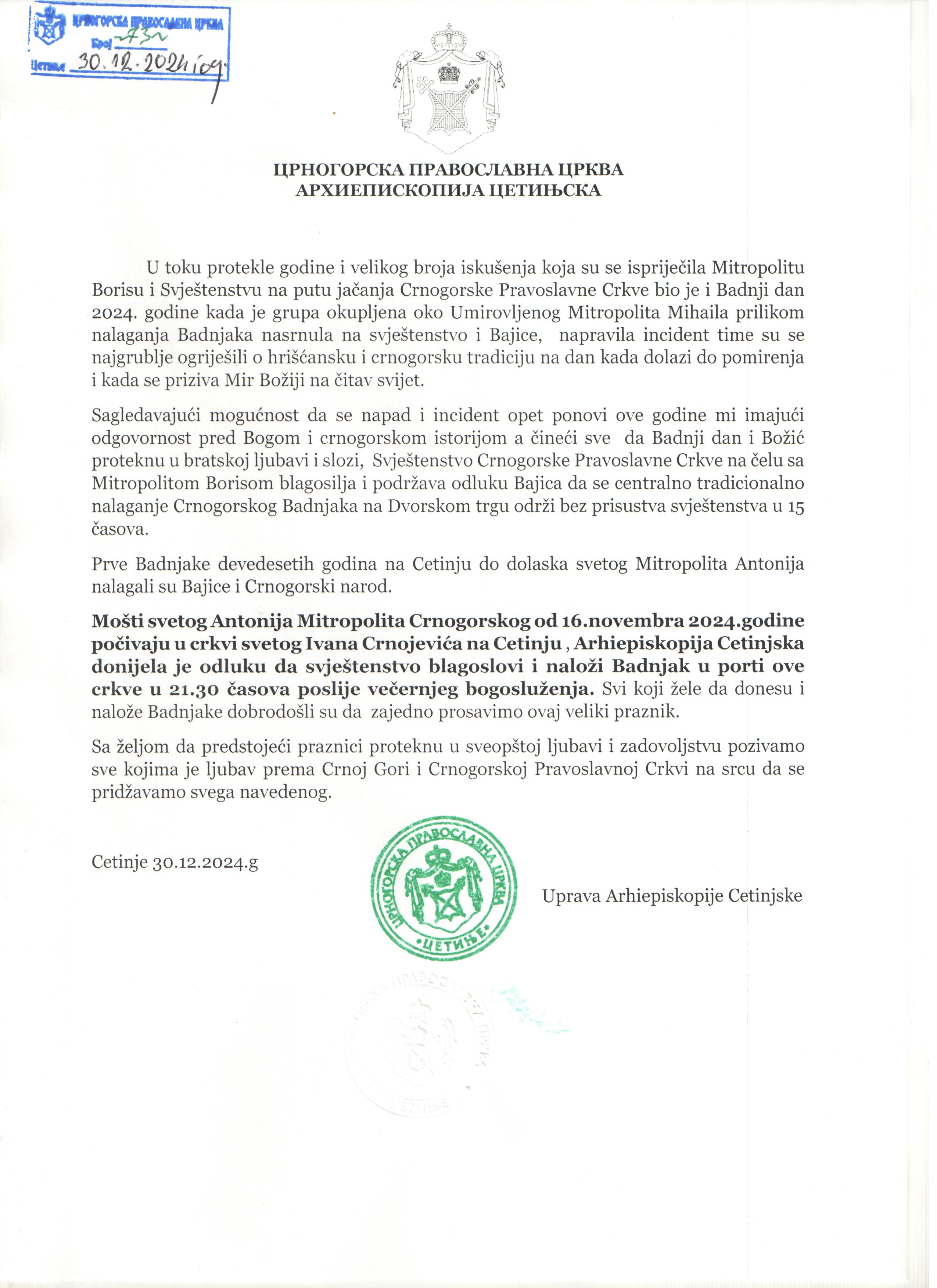 Mošti svetog Antonija Mitropolita Crnogorskog od 16.novembra 2024.godine počivaju u crkvi svetog Ivana Crnojevića na Cetinju , Arhiepiskopija Cetinjska donijela je odluku da svještenstvo blagoslovi i naloži Badnjak u porti ove crkve u 21.30 časova poslije večernjeg bogosluženja. Svi koji žele da donesu i nalože Badnjake dobrodošli su da  zajedno prosavimo ovaj veliki praznik.