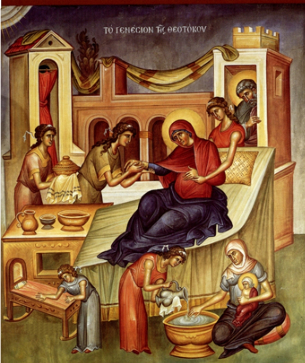 Rođenje Presvete Bogorodice – Mala Gospođa. Sveta Djeva Marija rodila se od roditelja Joakima i Ane koji bijahu stari. Otac joj je bio iz plemena Davidova, a majka od roda Aronova. Presveta Bogorodica bijaše po ocu od carskog roda, a po majci od  arhijerejskog roda. Njeni roditelji već ostarali, nijesu imali đece. To  bijaše razlog da budu postiđni pred ljudima i skrušeni pred Bogom. U skrušenosti su se molili da Bog usliši i obraduje ih darovanjem jednoga đeteta. Bog milostivi kao što je u prošlosti obradovao stare Avrama i Saru darovavši im sina Isaka. Tako i njih Bog svemogući i svevideći obradova, jer im darova ne samo ćerku nego i Bogomajku. Dade im Bog jednu ćerku, koja im docnije rodi jednog unuka Isusa Hristosa. Blagodatna Marija, blagoslovena među ženama, hram Duha Svetoga, oltar Boga Živoga, trpeza hljeba nebeskoga, kivot svetinje Božije, drvo najslađega ploda, slava roda ljudskog, pohvala roda ženskog, istočnik djevstvenosti i čistote – to bijaše Bogom darovana ćerka svetih Joakima i Ane. Rođena u Nazaretu, a posle 3 godine odvedena u hram Jerusalimski, odakle se vratila opet u Nazaret, da uskoro čuje blagovijest sv. arhanđela Gavrila o rođenju Sina Božijeg, Spasitelja svijeta, iz njenoga prečistoga i djevičanskoga tijela.