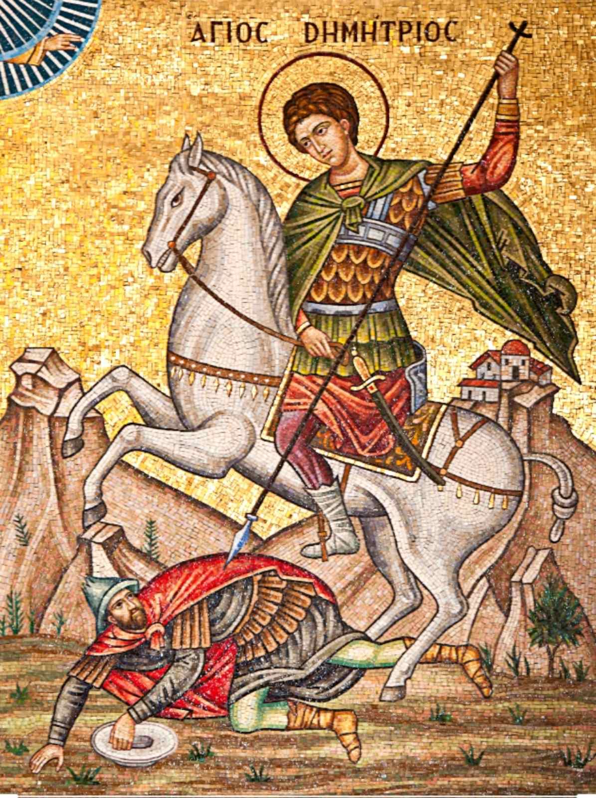 Sveti Dimitrije solunski  veliki i čudotvorni svetitelj rodio se u Solunu. Sveti Dimitrije bijaše jedino dijete svojih blagočestivih roditelja, pa je sa posebnom pažnjom vaspitavan i podizan. Otac mu bijaše vojvoda Solunski. Poslije očeve smrti, bi  postavljen  Dimitrije na očevo mjesto, kao vojvoda. Car Maksimijan koji se borio protiv hrišćana naročito je tražio da Dimitrije goni i ubija hrišćane u Solunu. Sveti Dimitrije nije poslušao cara Maksimilijana nego je javno ispovijedao i propovijedao Gospoda Isusa Hristosa. Kada  car sazna za to veoma se naljuti na Dimitrija. Car Maksimijan naročito dođe u Solun, da stvar ispita. Pozva car Dimitrija i ispitivaše ga o vjeri. Sveti  Dimitrije javno prizna pred carem i narodom da je hrišćanin, i još se usprotivi carevom idolopoklonstvu. Car utamniči svetog Dimitrija. A on  znajući šta ga čeka predade sav svoj imetak  svom vjernome slugi Lupu, da ga razdijeli najsiromašnijima. U tamnici mu se javi anđeo božiji i reče mu: „mir tebi, stradalniče Hristov, hrabri se i krijepi se!" Poslije nekolikog vremena  po zapovijedi  carevoj  vojnici dođoše u tamnicu da ubiju svetog Dimitrija. Vojnici nađoše svetitelja Božjeg kako se moli i tu ga  izbodoše kopljem. Tijelo njegovo uzeše pobožni hrišćani i tajno sahraniše. Tijelo stradaoca Hristova Dimitrija postade mirotočivo, i mnogi se bolesnici izliječiše. Uskoro nad grobom đe počivahu mošti svetog Dimitrija bi podignuta manja crkva. Velikaš Leontije koji bijaše bolestan neizlječivo pristupi moštima svetog Dimitrija moleći se, i bi potpuno izliječen. Iz zahvalnosti Leontije sazida mnogo veću crkvu na mjestu stare. Sveti Dimitrije je zaštitnik grada Soluna i mnogo puta se javljao vjernima i puno puta spasio Solun. Čudima njegovim nema broja.