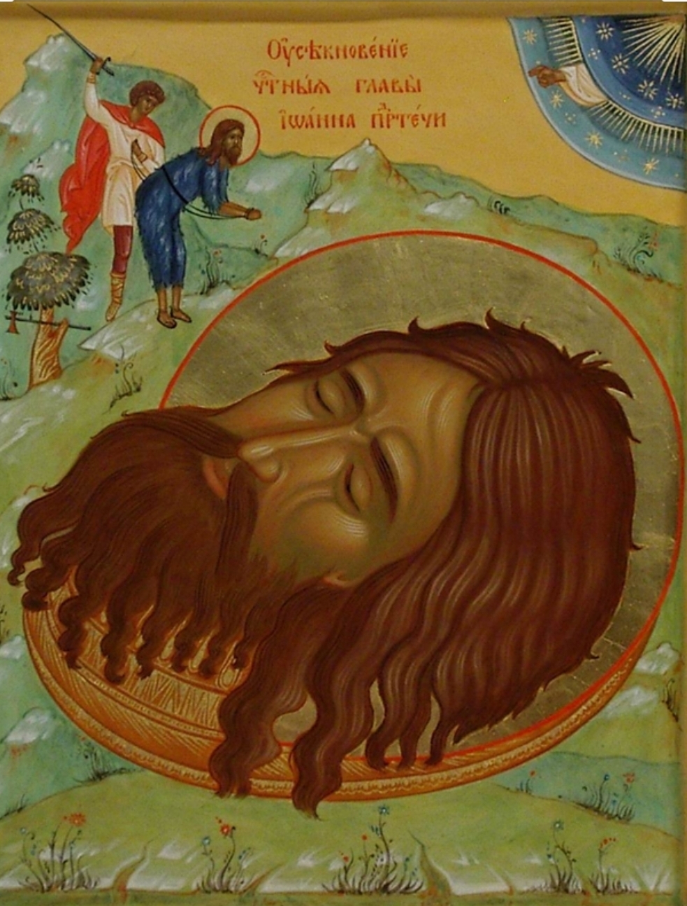 Usijecanje glave sv.JovanaUsijecanje glave sv. Jovana Krstitelja. Irod Antipa, sin staroga Iroda, koji naredi ubijstvo đece Vitlejemske u vrijeme rođenja Gospoda Isusa Hristosa, bijaše gospodar Galileje u vrijeme propovijedi svetog Jovana Krstitelja. Bijaše taj Irod oženjen ćerkom nekoga arabskog kneza Arete. No Irod, zli izdanak od zloga korijena, oćera svoju zakonitu ženu i nezakonito uze sebi Irodijadu, ženu svoga brata Filipa, koji bijaše živ. Protiv ovog bezakonja usta sveti Jovan Krstitelj i silno izobliči Iroda. Irod ga zatvori u tamnicu. Za vrijeme jednoga pira u svom dvoru u Sevastiji Galilejskoj igraše pred gostima Salomija, ćerka Irodijadina i Filipova. I pijani Irod, zanesen tom igrom, obeća Salomiji da će joj dati što god bude od njega tražila, pa čak to bilo i polovina njegovog carstva. Nagovorena od svoje majke Salomija je tražila glavu svetog Jovana Krstitelja. Irod naredi te svetog Jovana posijekoše i doniješe mu njegovu glavu na tanjiru. Učenici Jovanovi noću tajno uzeše tijelo svoga učitelja i časno sahraniše, a Irodijada izbode iglom jezik svetoga Jovana, pa glavu zakopa na neko nečisto mjesto. Ali ubrzo prstiže kazna Božija za ove zlotvore. Knez Areta, da opere čast svoje ćerke, udari s vojskom na Iroda i porazi ga. Rimski vladar Kaligula poraženog Iroda osudi na prognanstvo prvo u Galiju, a onda u Španiju. U zadnjoj bijedi i poniženju skončaše Irod i Irodijada. A Salomija pogibe zlom smrću na rijeci Sikorisu (Suli). Smrt svetog Jovana dogodila se pred Pashu, a praznovanje ovog na ovaj datum ustanovljeno je zbog toga što je toga dana osvjećena crkva, koju podigoše na grobu njegovom u Sevastiji car Konstantin i carica Jelena. U tu crkvu položene su i mošti učenika Jovanovih: Jeliseja i Avdije.
